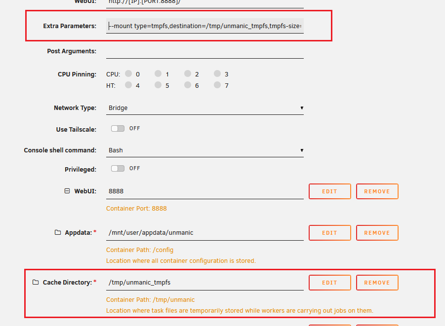 - Go to the Docker tab, click Unmanic, and select Edit to open the container template.