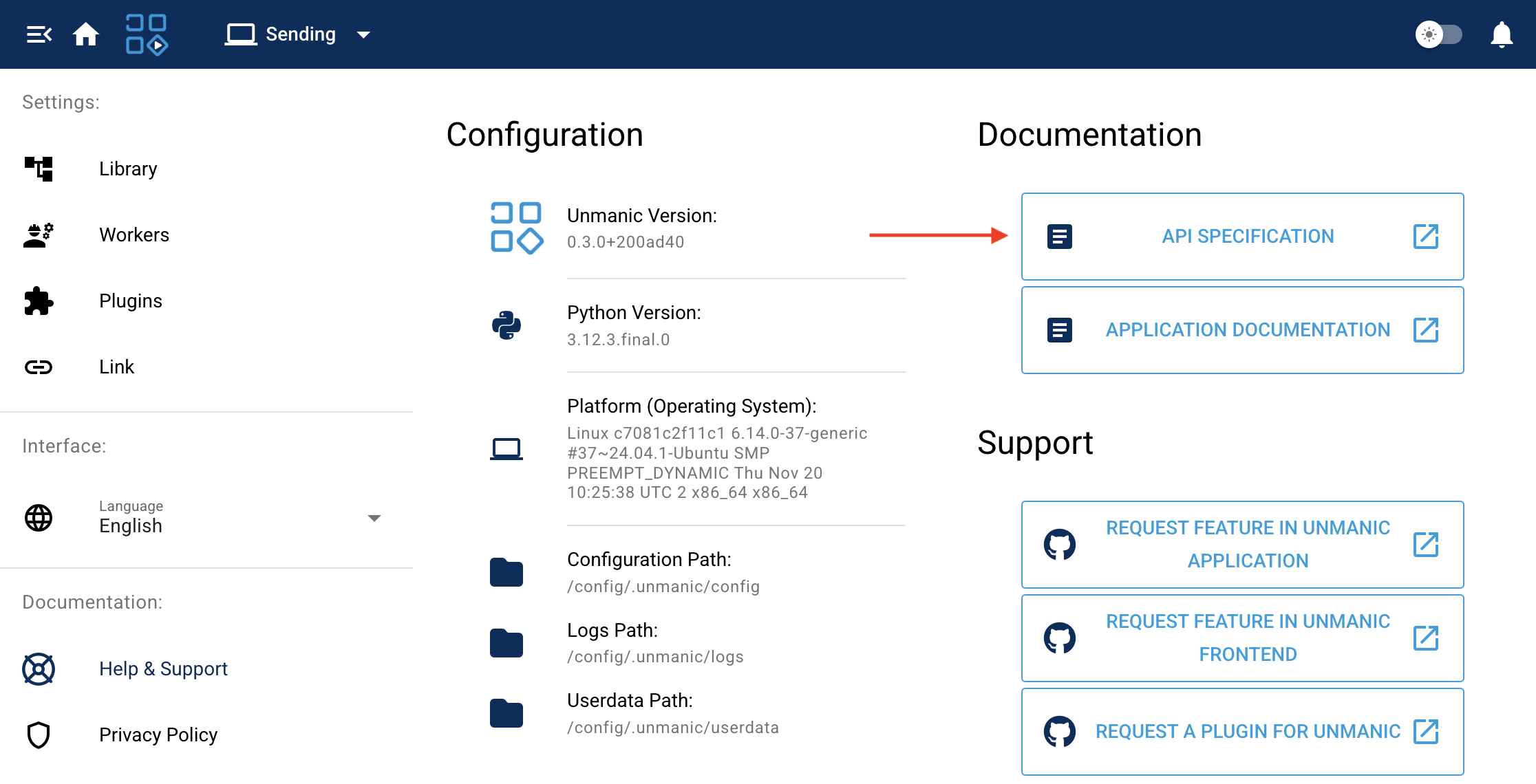 Unmanic includes built-in API documentation accessible directly from your Unmanic instance. Navigate to your Unmanic web interface and access the API documentation section (Home -> Settings -> Help and Support) to explore all available endpoints, request formats, and response structures.